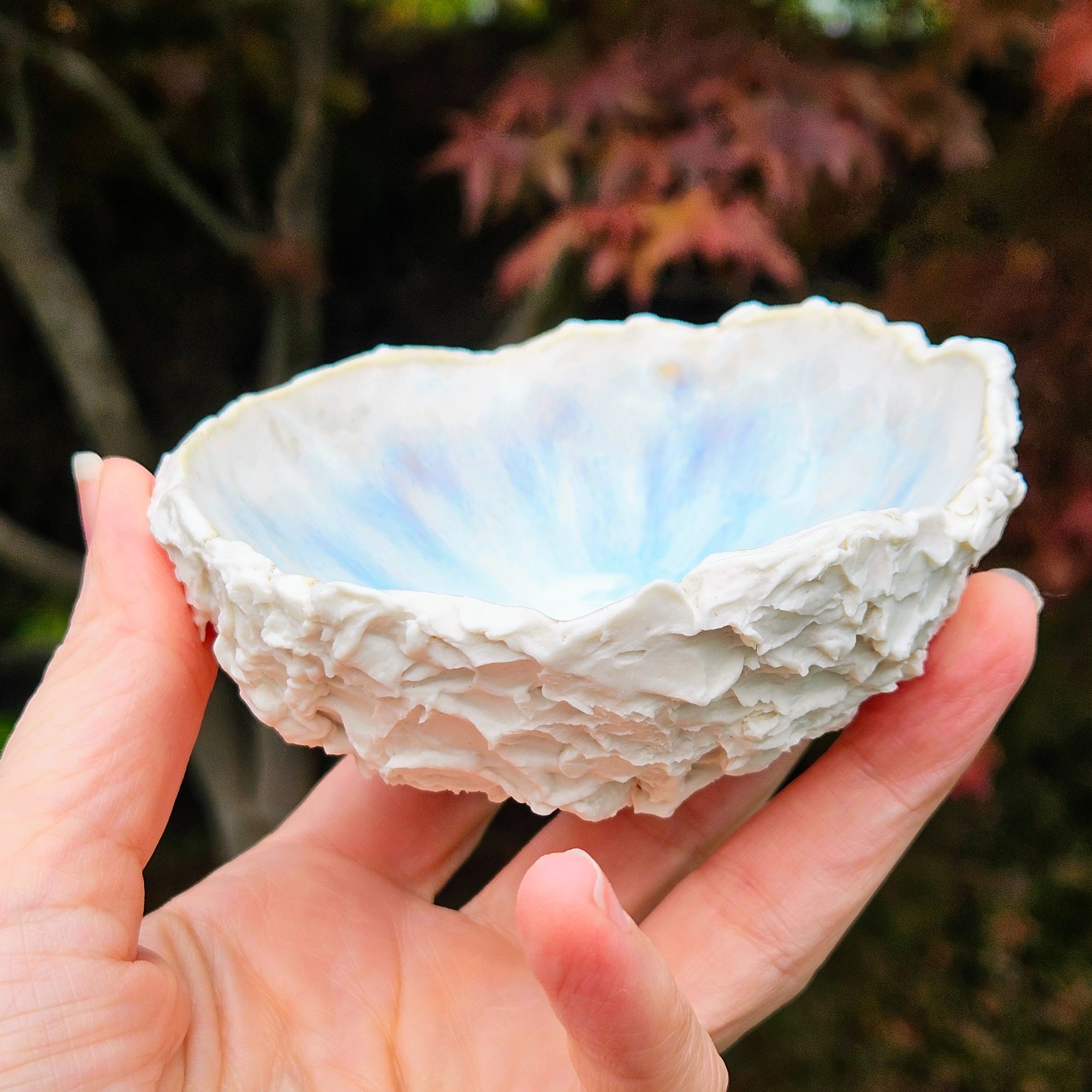 I love to create contrasts, with many of my pieces combining natural, raw white exteriors with vibrant interior glazes.