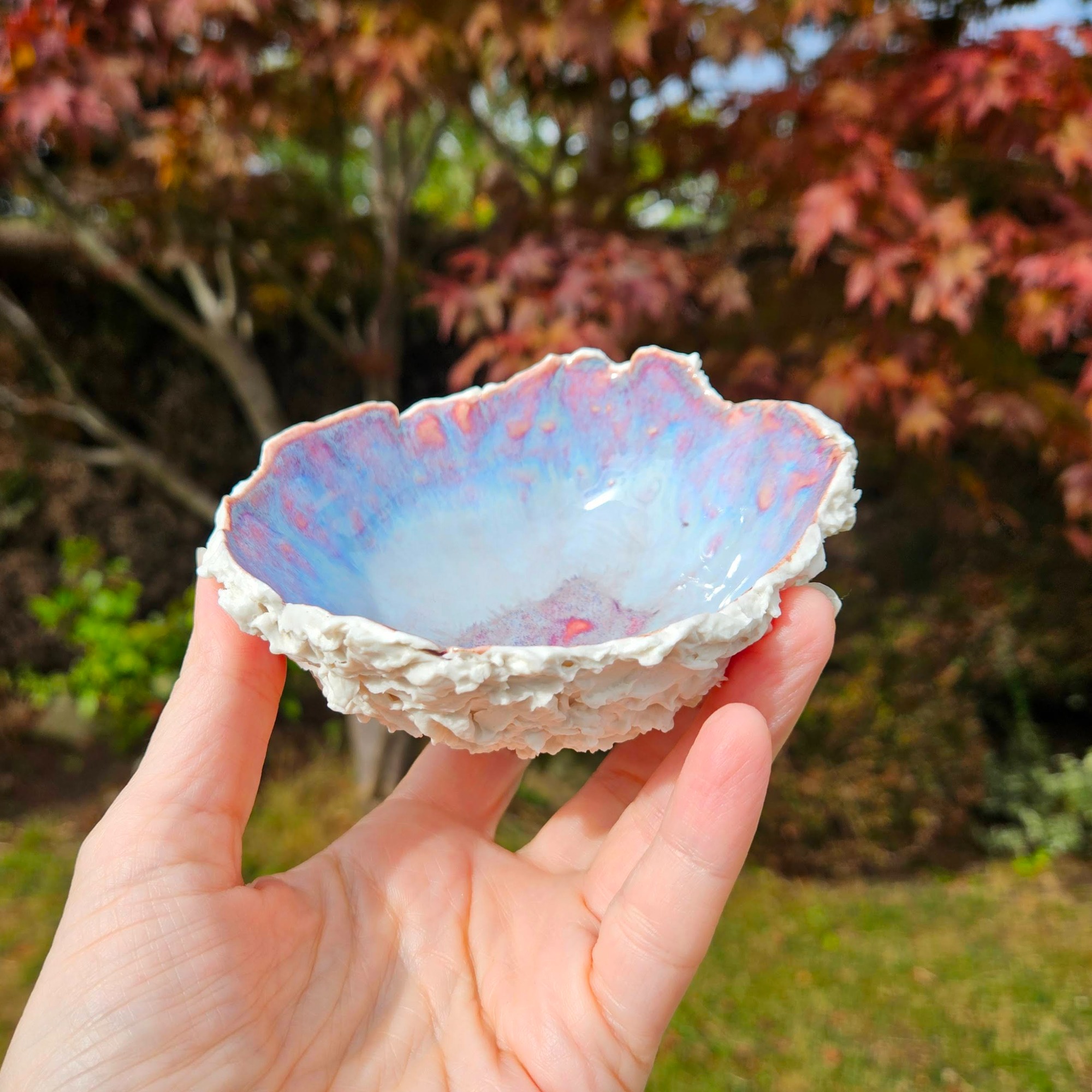 Delicate, translucent porcelain glazed in purples, blues, sand and pearly whites.